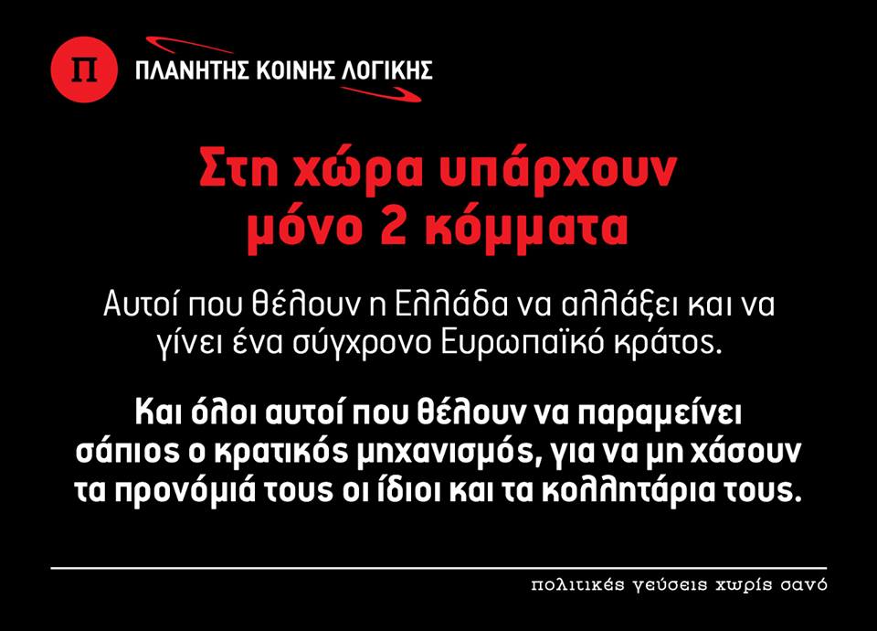 Κάτι ανάλογο μου έλεγε και ένα άλλο φιλαράκι από τα παλιά που έχουμε διαφωνήσει πολλάκις τα τελευταία χρόνια για τις πολιτικές εξελίξεις, καθώς τυγχάνει στέλεχος της αριστεράς. Είχαμε να μιλήσουμε καιρό μάλιστα, γιατί την τελευταία φορά είχε θυμώσει με αυτά που του είπα για το τι ακριβώς θα συμβεί όταν το κόμμα του έρθει στην εξουσία.