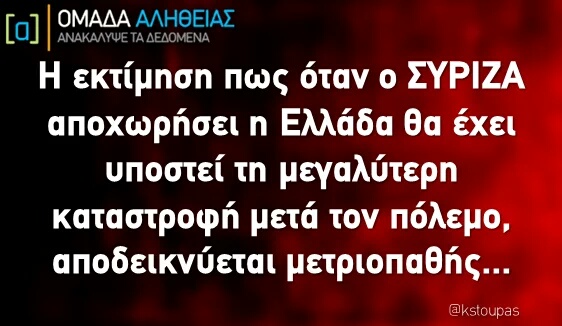 Δυστυχώς όσο δεν υπάρχει μια σαφής μεταρρυθμιστική πλειοψηφία στην κοινωνία, όχι ο Κυριάκος αλλά ούτε ο Θεός δεν μπορεί να βγάλει τη χώρα από το αδιέξοδο, την πορεία φτωχοποίησης και τα χειρότερα...